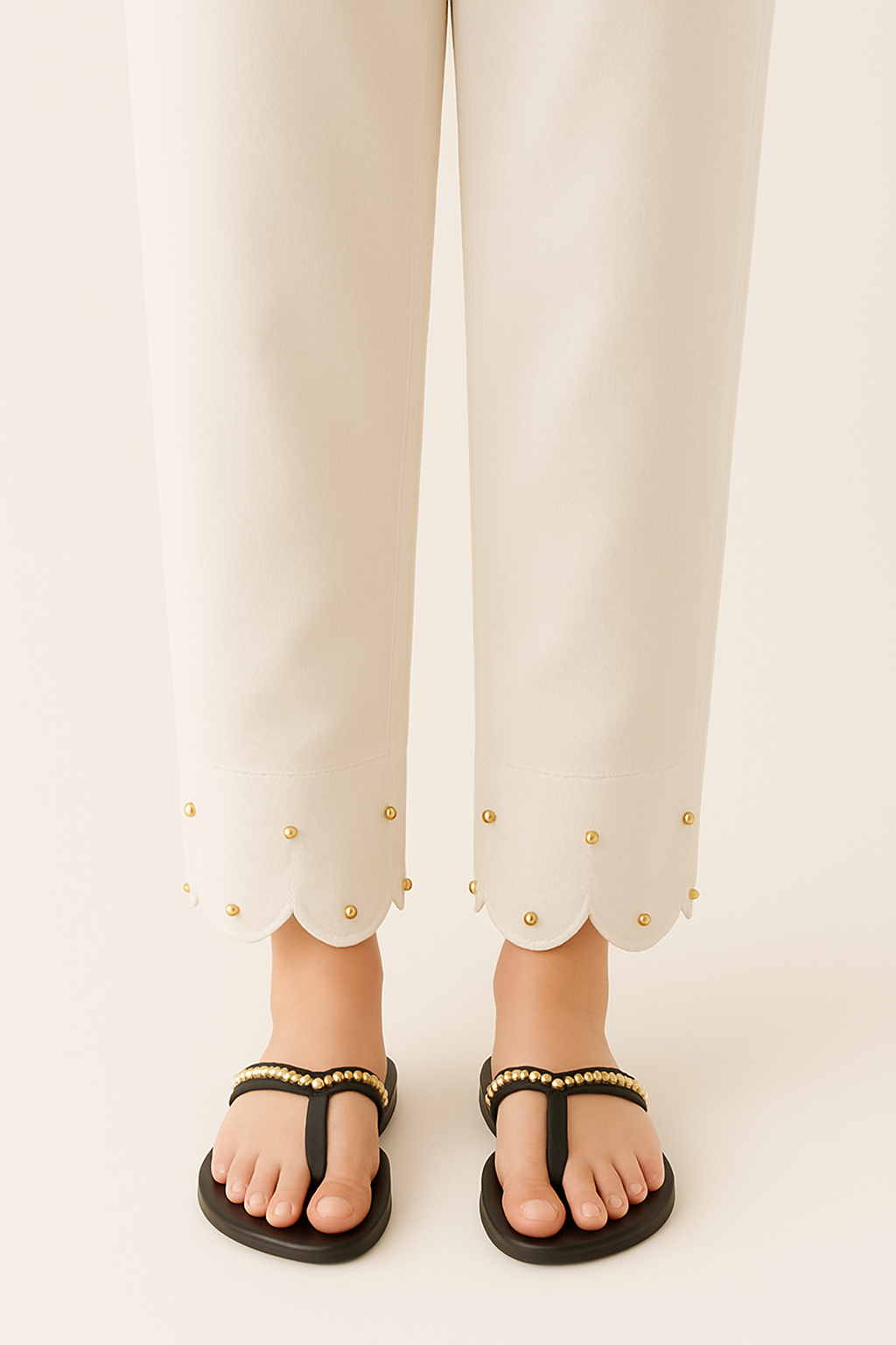 Introducing our Embellished Trousers with Cut Work & Golden Pearls, a blend of modern detailing and everyday comfort. Designed to bring subtle elegance to your wardrobe, these trousers feature nicely designed and stitched cut work and Golden pearls at the hems.