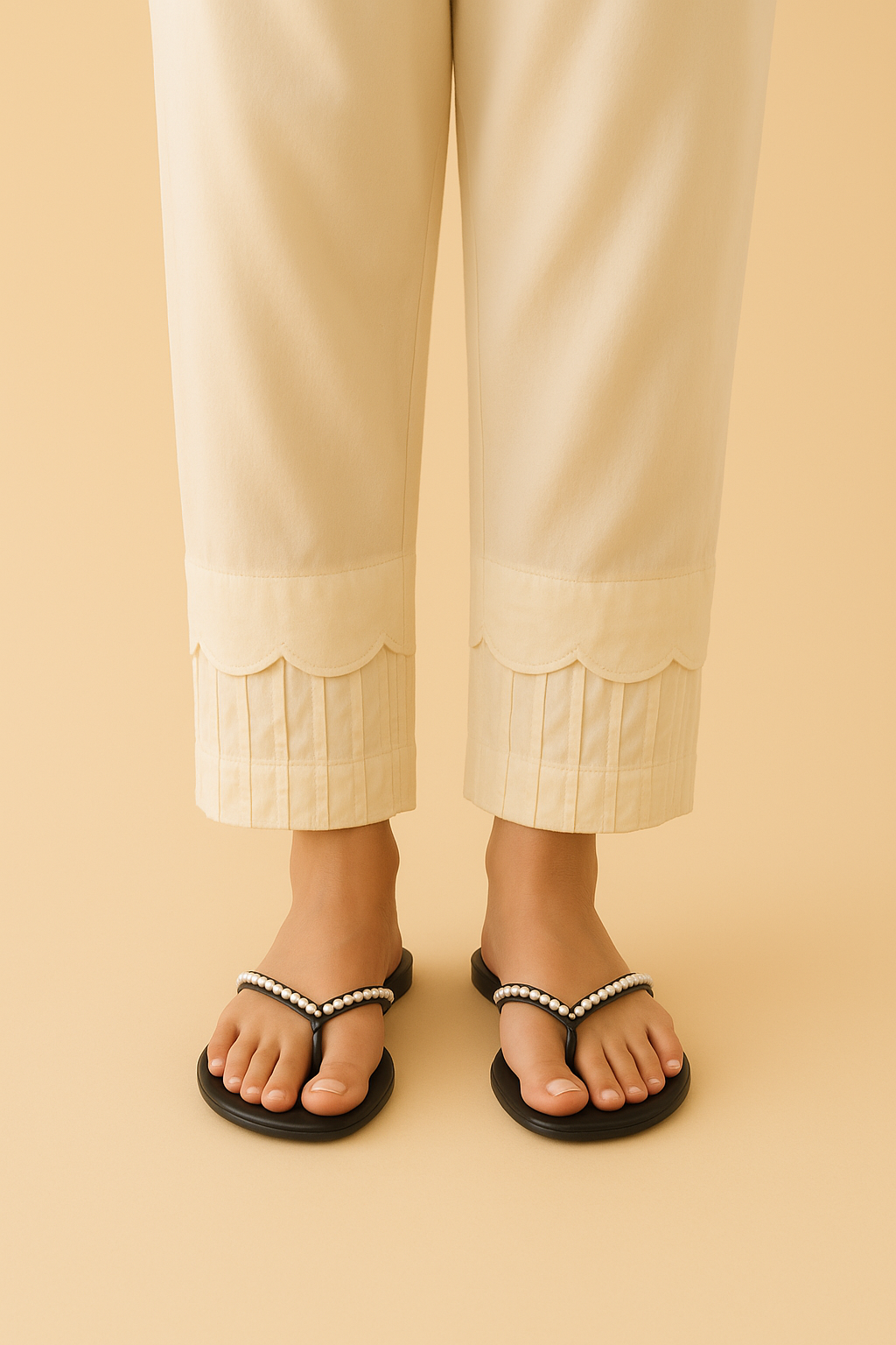 Introducing our Embellished Trousers with Cut Work & Pleats (Pintucks), a blend of modern detailing and everyday comfort. Designed to bring subtle elegance to your wardrobe, these trousers feature nicely designed and stitched cut work and pleats at the hems.