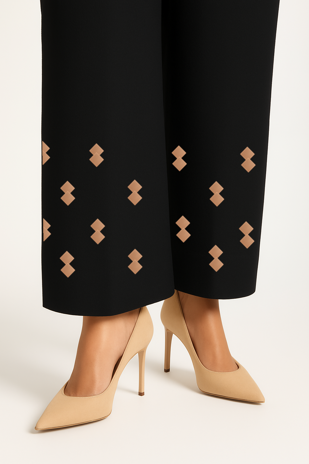 Black: Sophisticated base that makes prints pop. Refresh your rotation with our Women's Printed Palazzo Trousers in Black, designed for fluid drape, lasting comfort, and a polished look from day to night. Crafted from premium cotton, they’re durable and ready to wear on arrival.